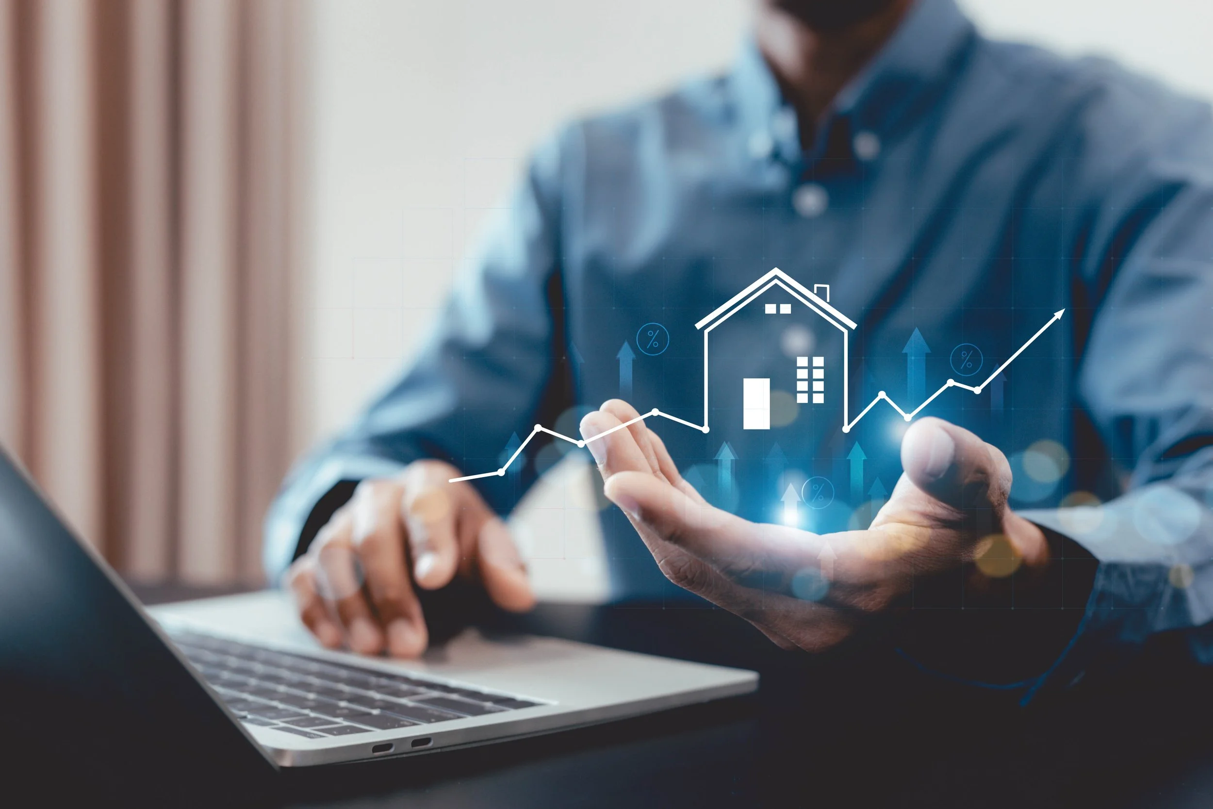 Persona sosteniendo una ilustración digital de una casa con gráficos de crecimiento y porcentajes, junto a una laptop.